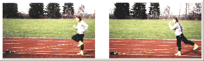 Hoher Kniehebegang auf dem Ballen mit Übersteigen des Stützbeines (links