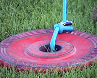 eines Thera-Band-Schlauches mit Karabinerhaken eingeklemmt