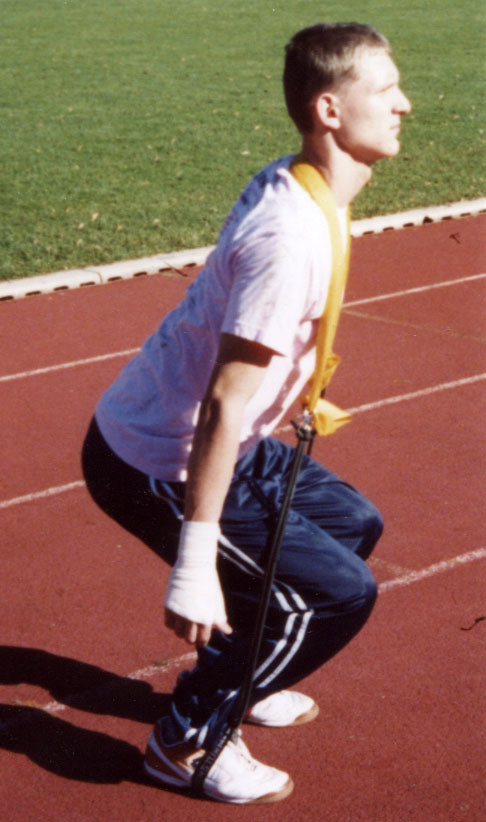 aus der 1/2-Hocke mit Auffangen des Körpers bei der Landung.